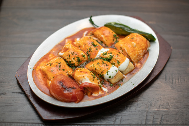 Turkish flatbread stuffed with ground beef & lamb and fresh garlic topped with tomato and yogurt garlic sauce.