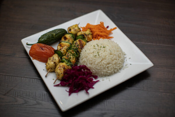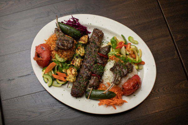 Comes with – Chicken Shish, Adana, Lamb Chops, and Beef Shish. Served with rice pilav, bulgur pilav, and vegetables.